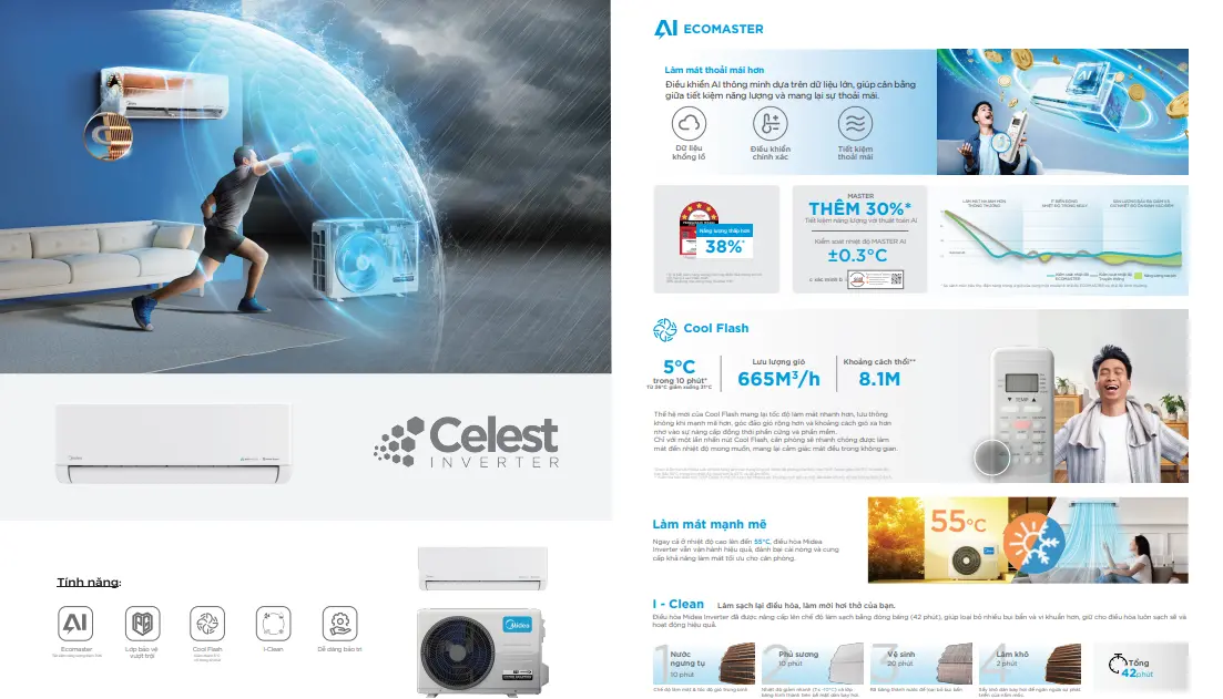 - Làm lạnh nhanh, cảm biến hướng gió theo người dùng