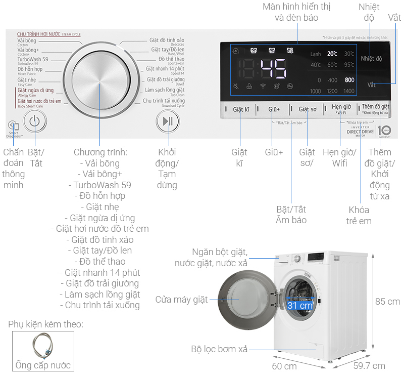 - Khối lượng giặt 10 kg